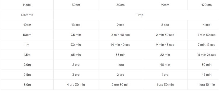 Timpul expunerii LED UVC la diferite distante cu eficienta 90% pentru a inactiva microorganismele: